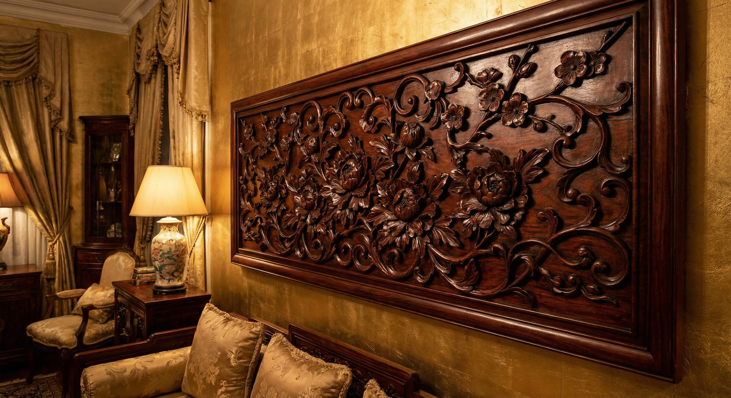 以传统万字纹为核心元素,结合花卉纹样的窗花格。选用缅甸花梨木,纹理细腻温润。浮雕与镂空工艺的巧妙结合,使图案更加立体生动。适用于书房窗户装饰或玄关隔断。
